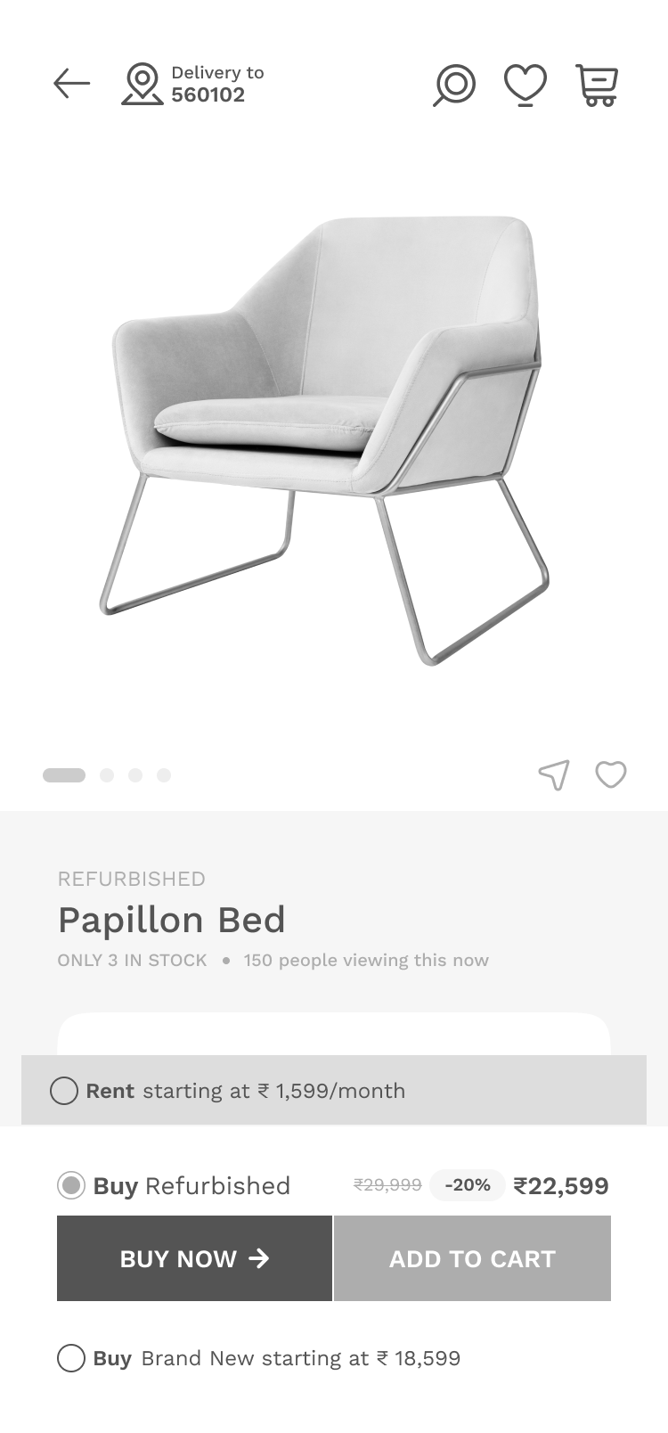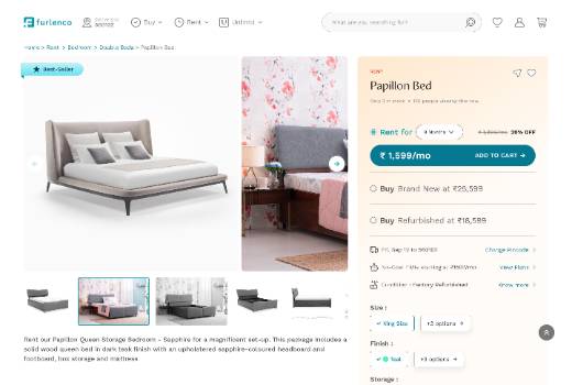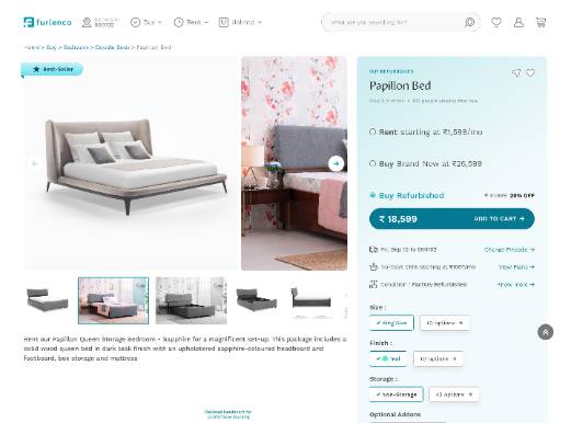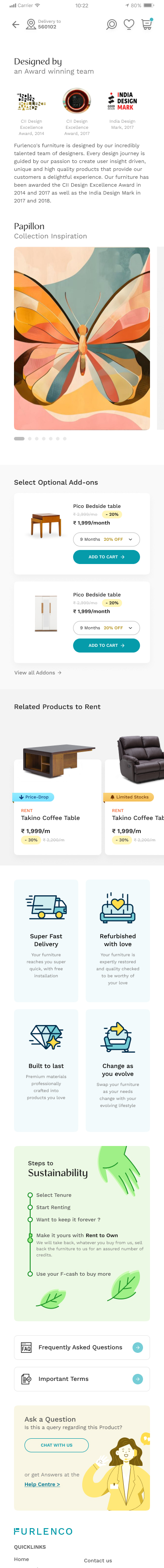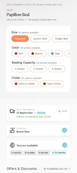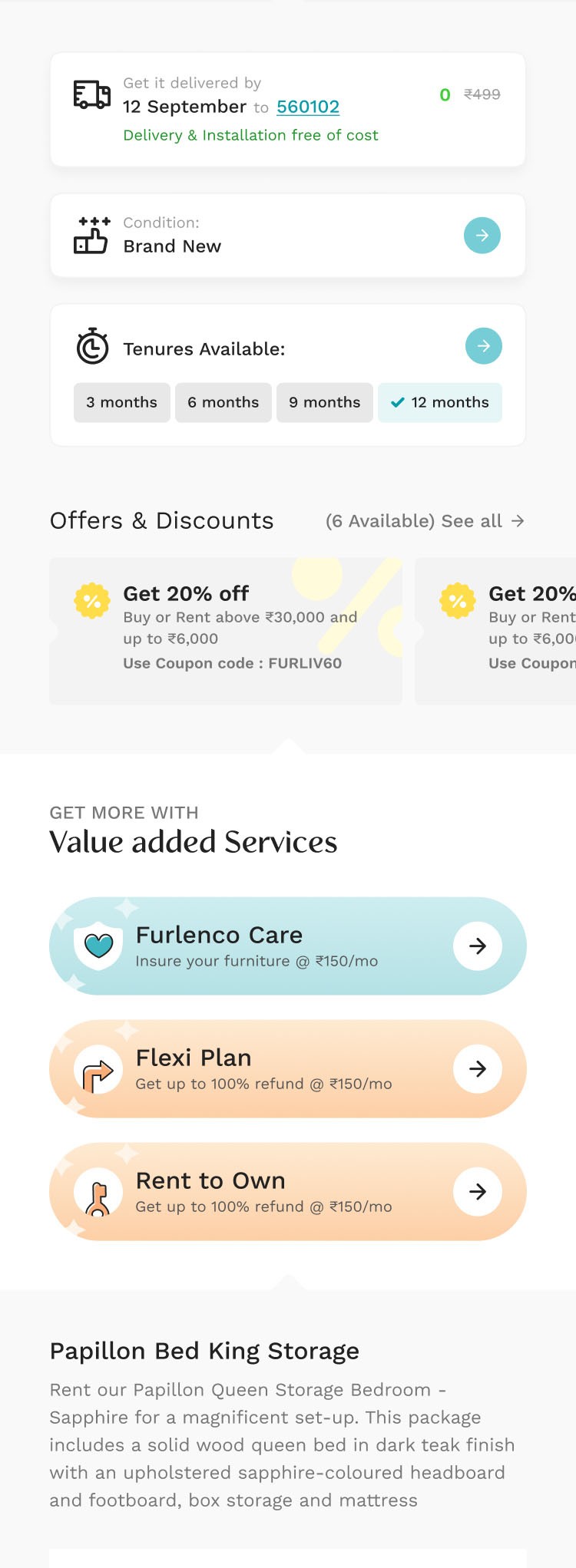 Consolidated Furlenco's distinct Rent and Buy models onto a unified Product Detail Page for the Furlenco 2.0 strategy. This simplified the user experience by showcasing flexible options without decision-making friction.