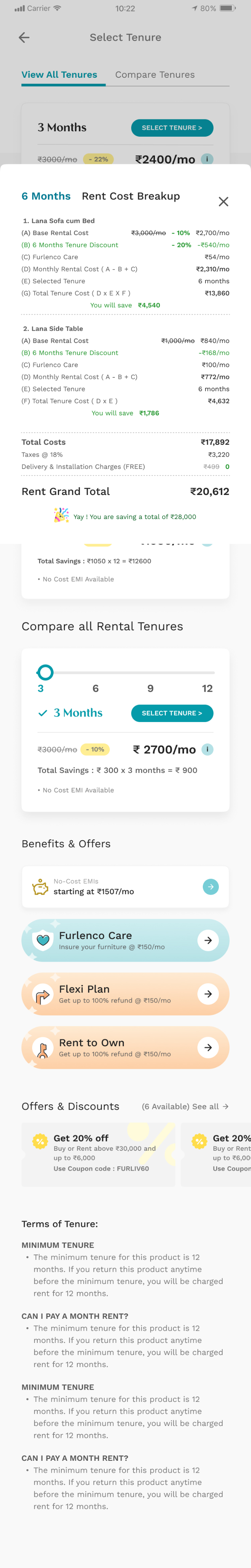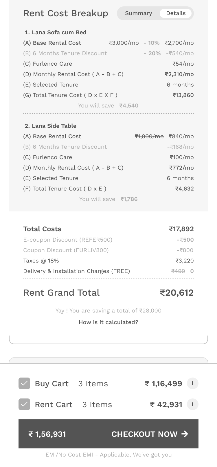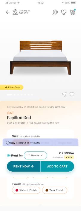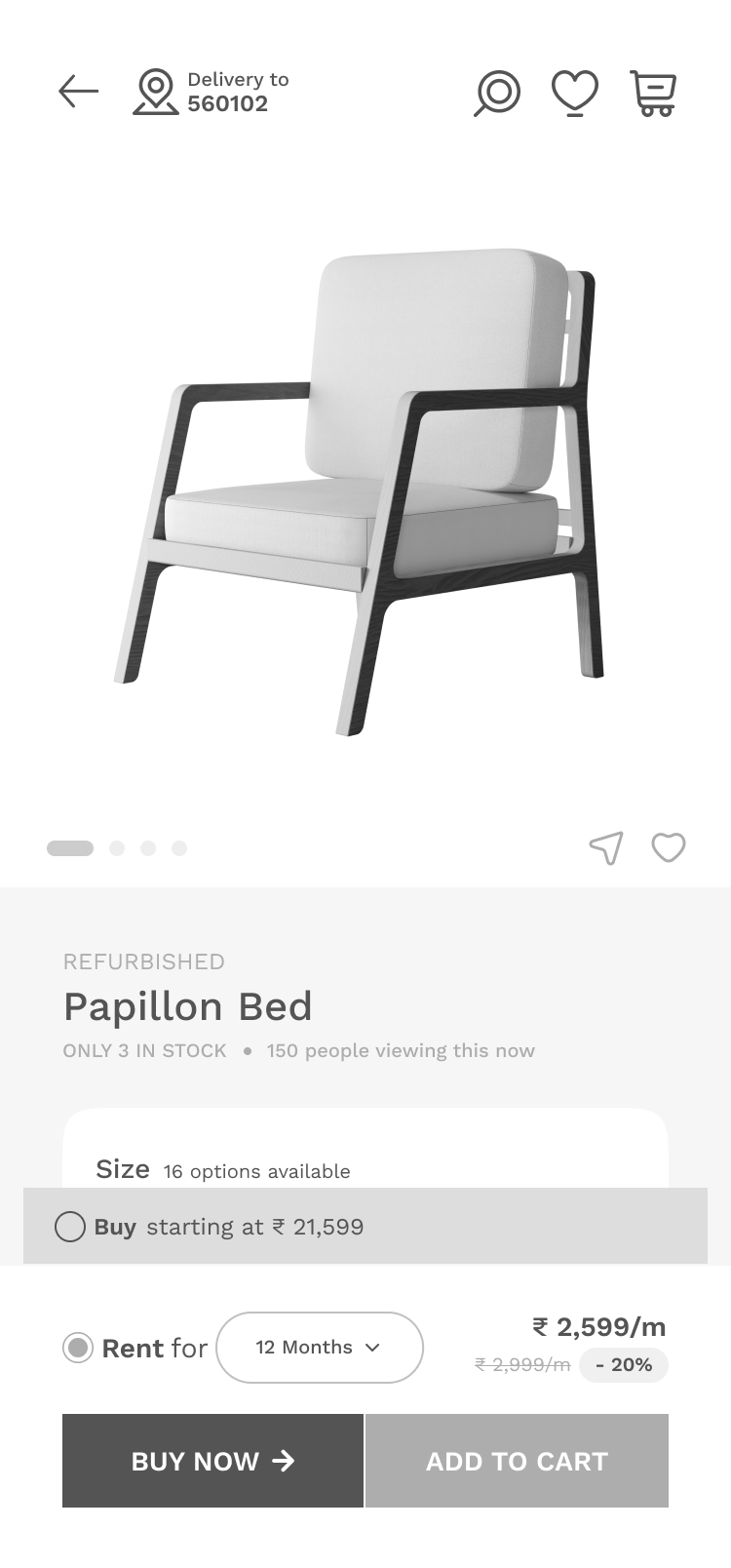 Consolidated Furlenco's distinct Rent and Buy models onto a unified Product Detail Page for the Furlenco 2.0 strategy. This simplified the user experience by showcasing flexible options without decision-making friction.