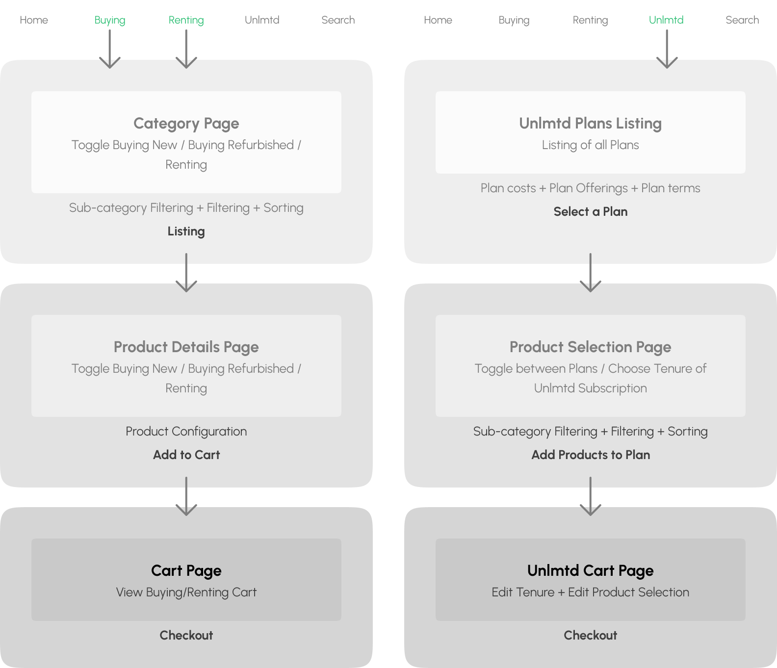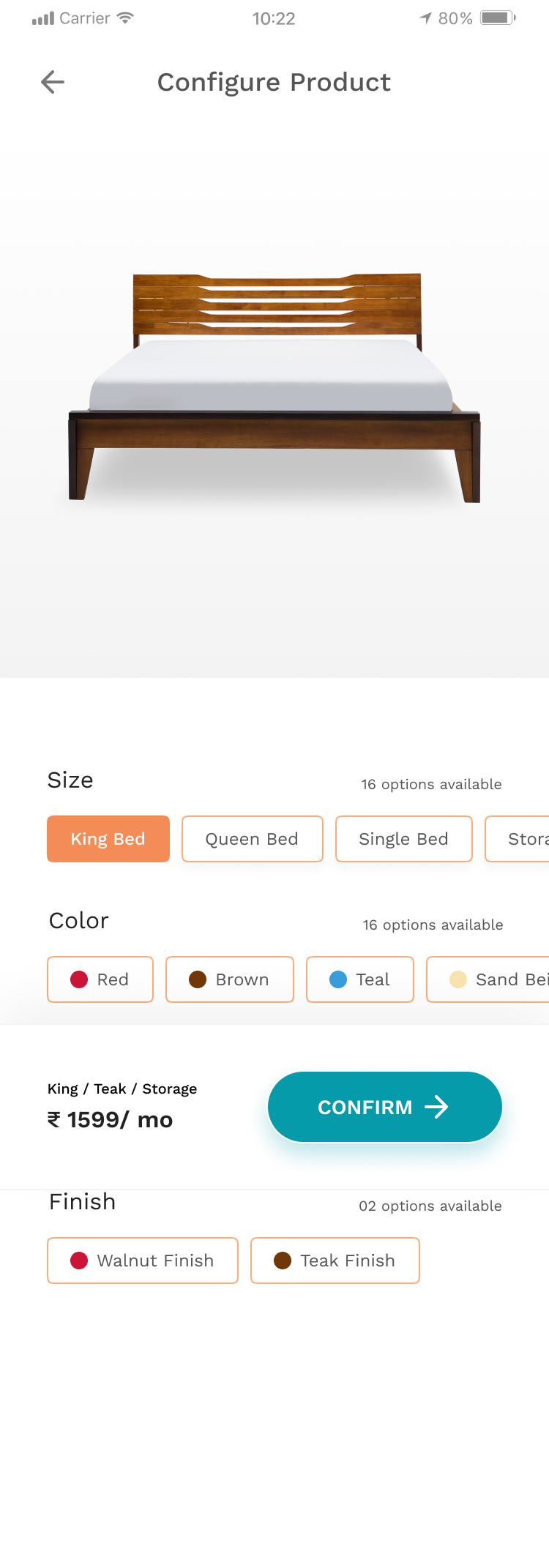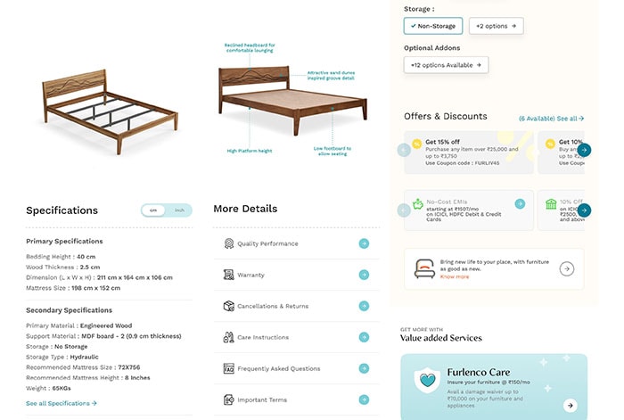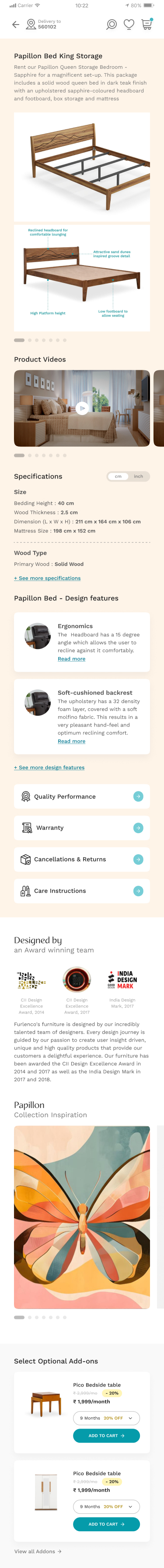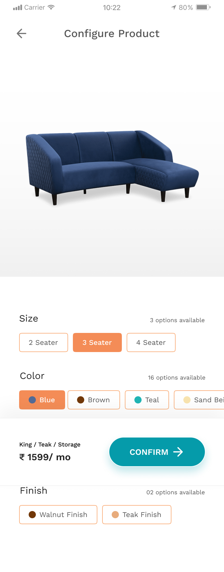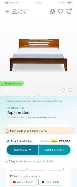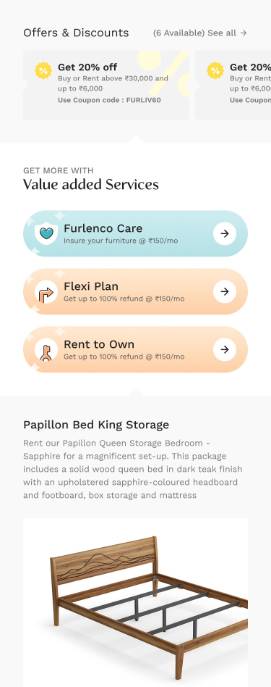 We designed Furlenco's information architecture to make it easy for users to switch between buying and renting directly from the product pages. By adding a furniture customization feature,