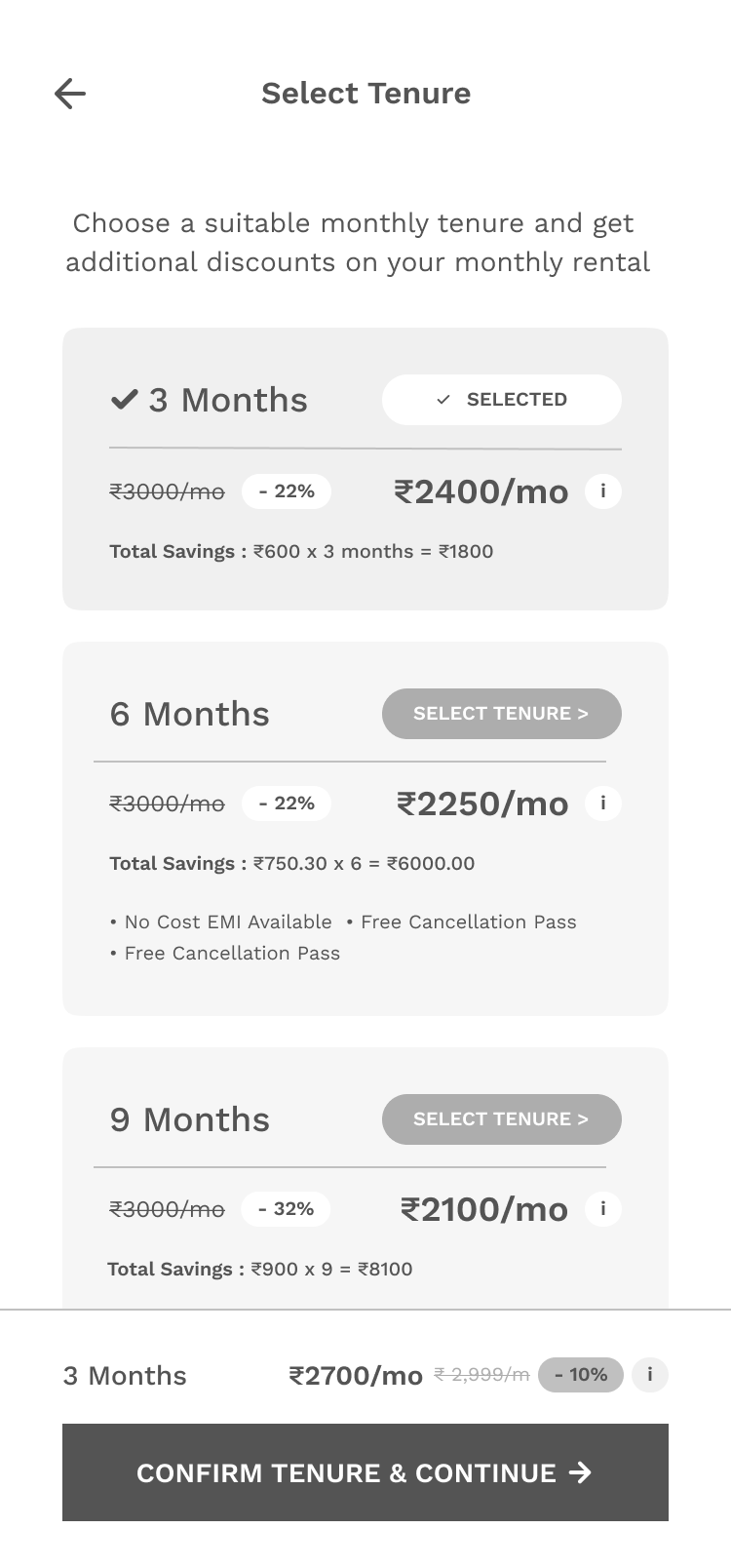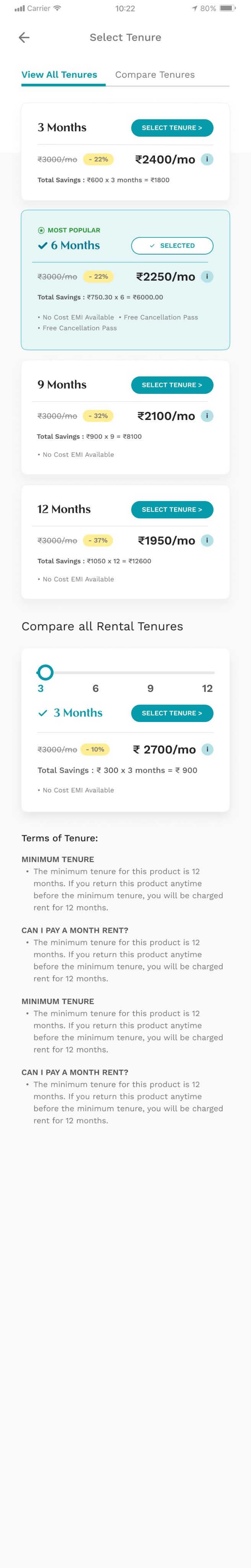 Created an intuitive interface for choosing rental durations, supported by detailed pricing breakdowns, value propositions, and emphasis on benefits like No-cost EMI.