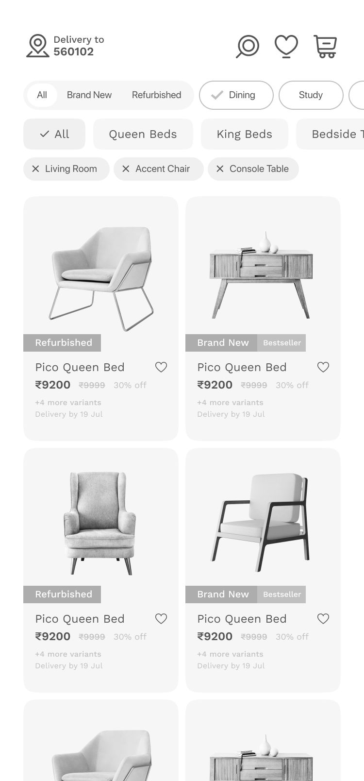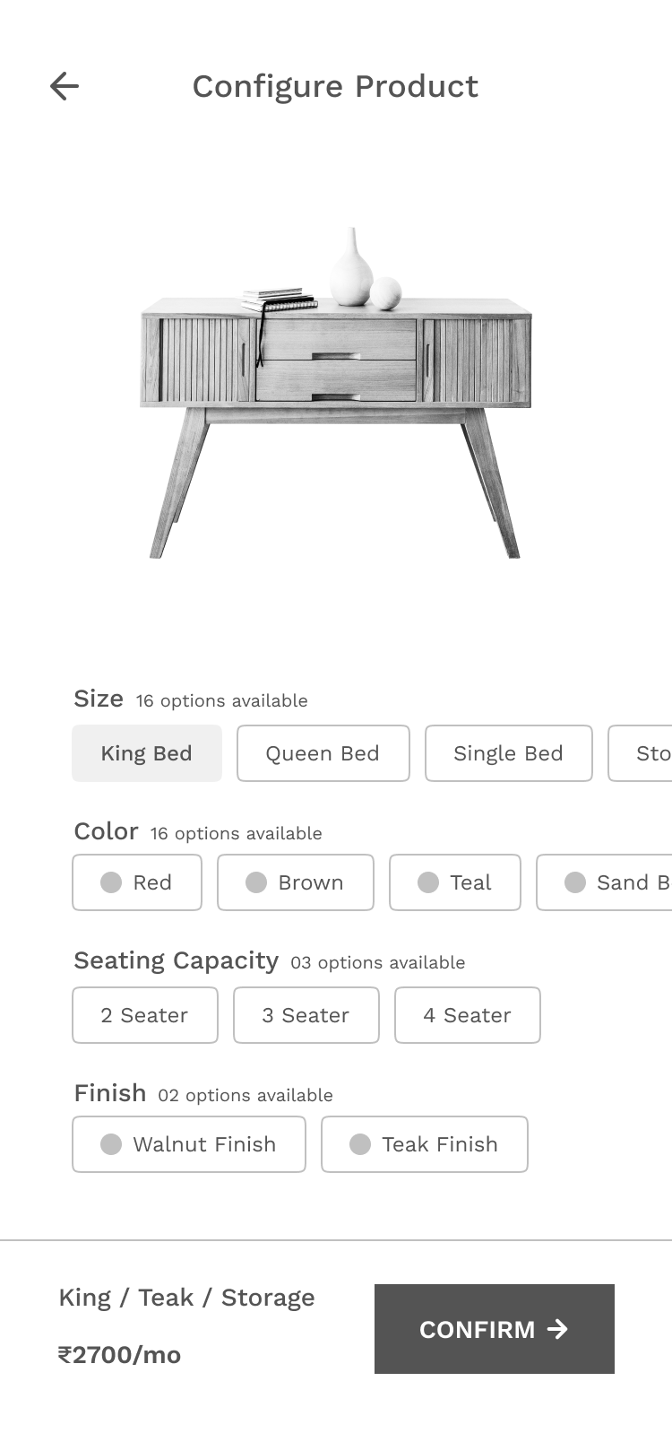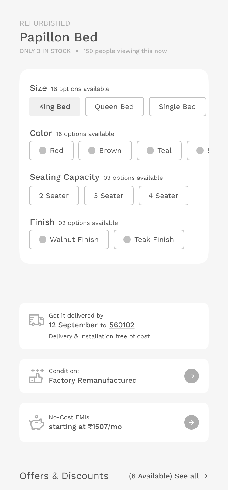 We designed Furlenco's information architecture to make it easy for users to switch between buying and renting directly from the product pages. By adding a furniture customization feature, we created a more personalized experience that guides users smoothly from browsing to selecting their final choice.