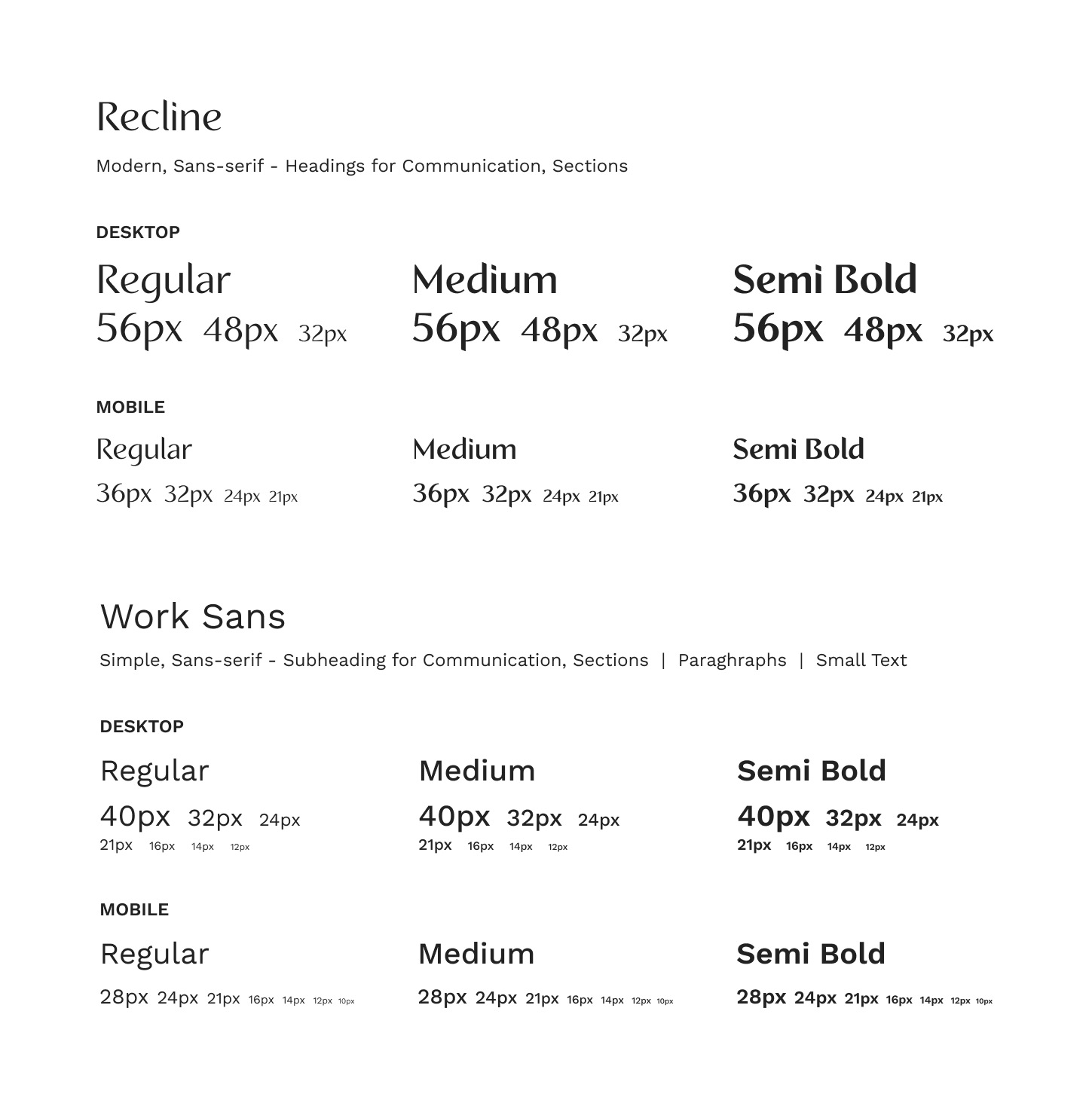 We used two fonts to establish a clear hierarchy: Recline for bold, edgy headings and Work Sans for simple, easy-to-read body text.
